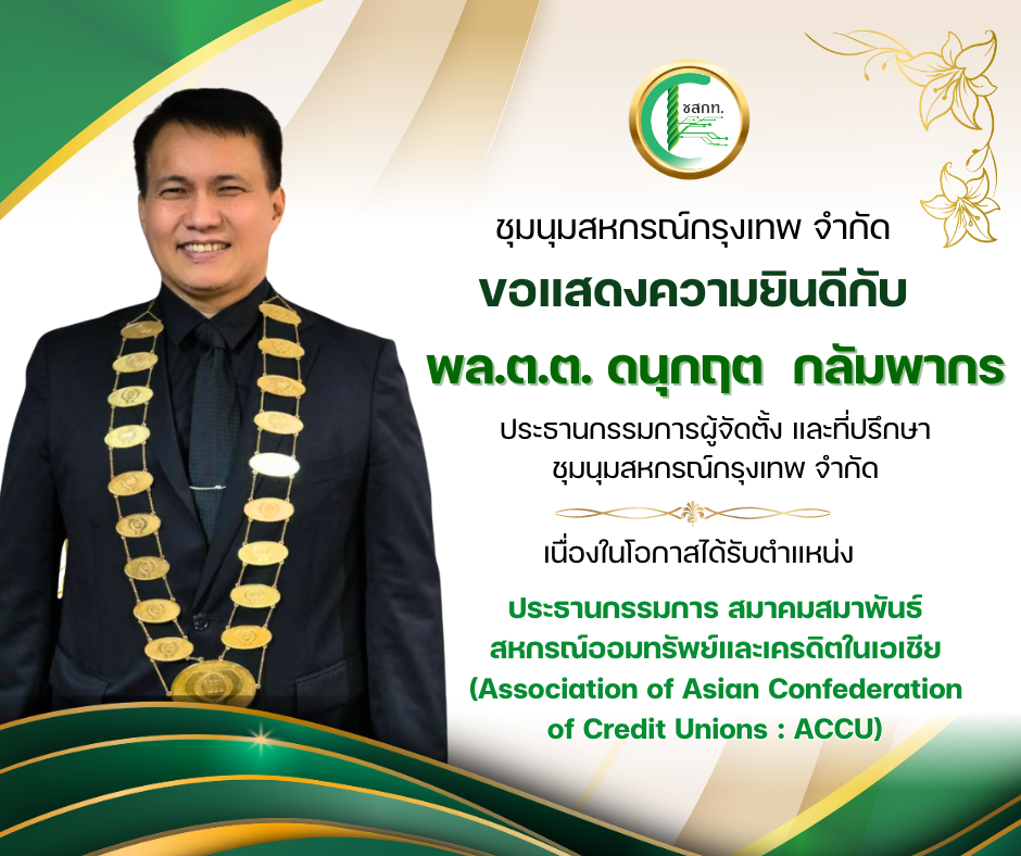 ขอแสดงความยินดีกับ พล.ต.ต. ดนุกฤต กลัมพากร ประธานกรรมการผู้จัดตั้ง และที่ปรึกษา ชุมนุมสหกรณ์กรุงเทพ จำกัด เนื่องในโอกาสได้รับตำแหน่ง ประธานกรรมการ สมา