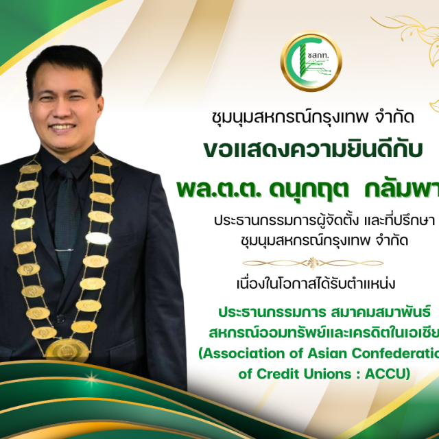 ขอแสดงความยินดีกับ พล.ต.ต. ดนุกฤต กลัมพากร ประธานกรรมการผู้จัดตั้ง และที่ปรึกษา ชุมนุมสหกรณ์กรุงเทพ จำกัด เนื่องในโอกาสได้รับตำแหน่ง ประธานกรรมการ สมา