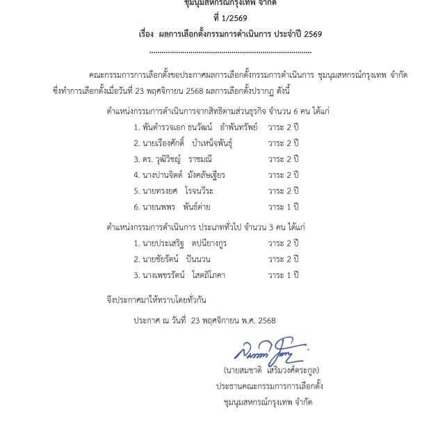 ประกาศผลการเลือกตั้ง กรรมการดำเนินการ ประจำปี 2569